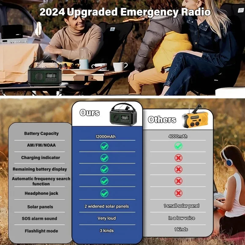 Packs high-value: ("solar emergency radio," "12000mAh power bank")