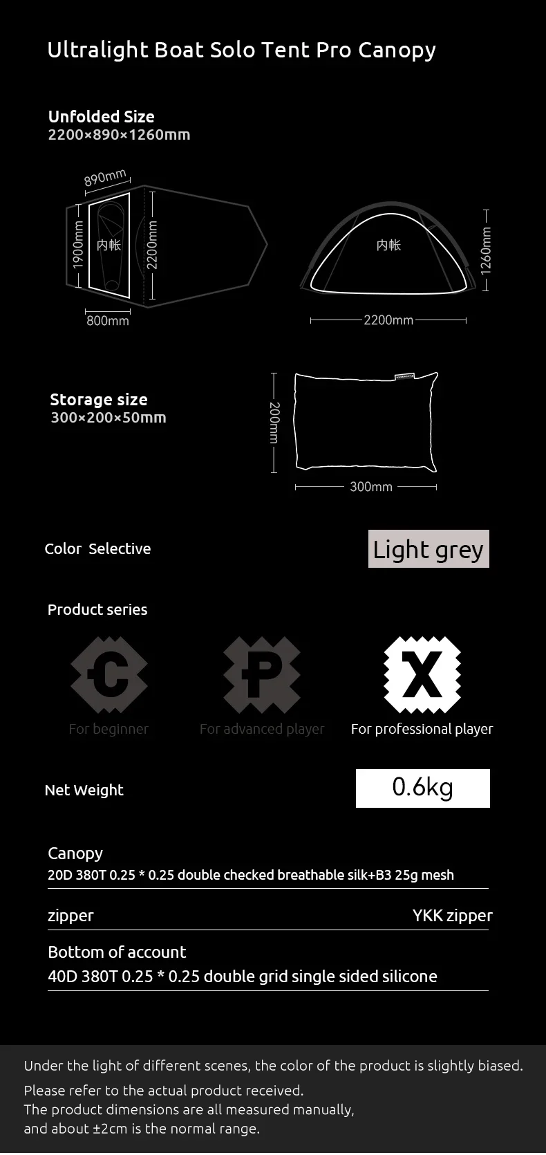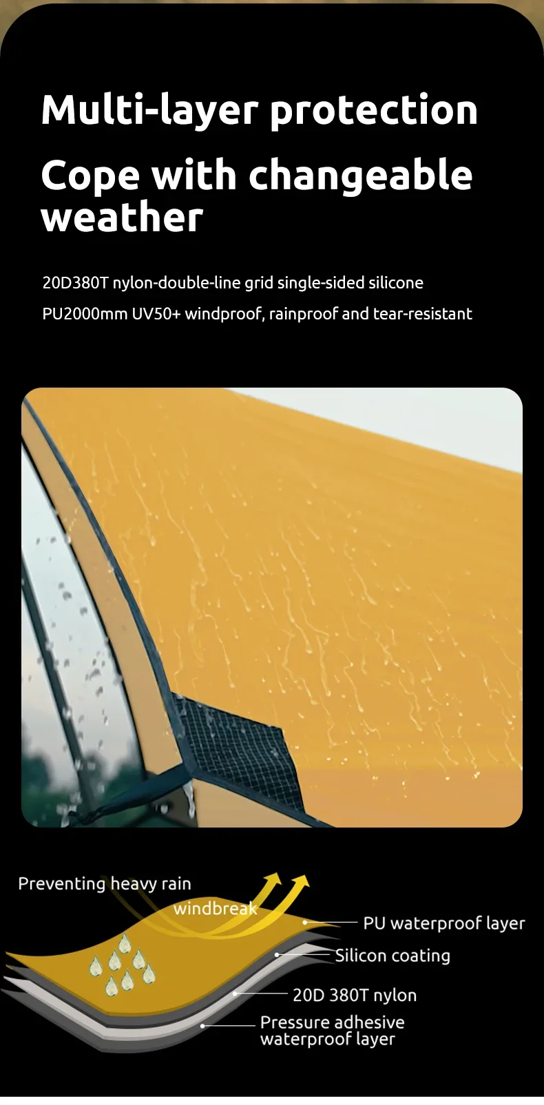 4.Outer tent:20D 380T nylon - Double-line grid single-sided silicone PU2000mm, Uv50+
