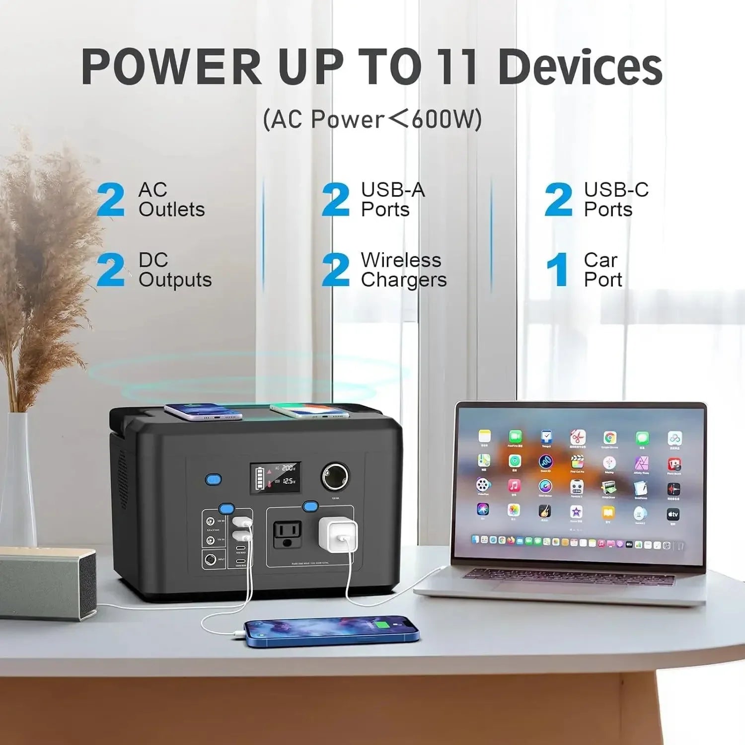 • CAMPING BATTERY WITH MOST PORTS - The outdoor backup lithium battery features 2 x AC outlet (110V 600W in total), 2 x USB-A port, 2 x USB-C port, 2 x 10W Wireless Charger, 2 x 12V DC port and 2 x charging port (USB-C, DC). Our portable power generator with wireless charger, you can easily charge 2 mobile phone without cable at the same time.