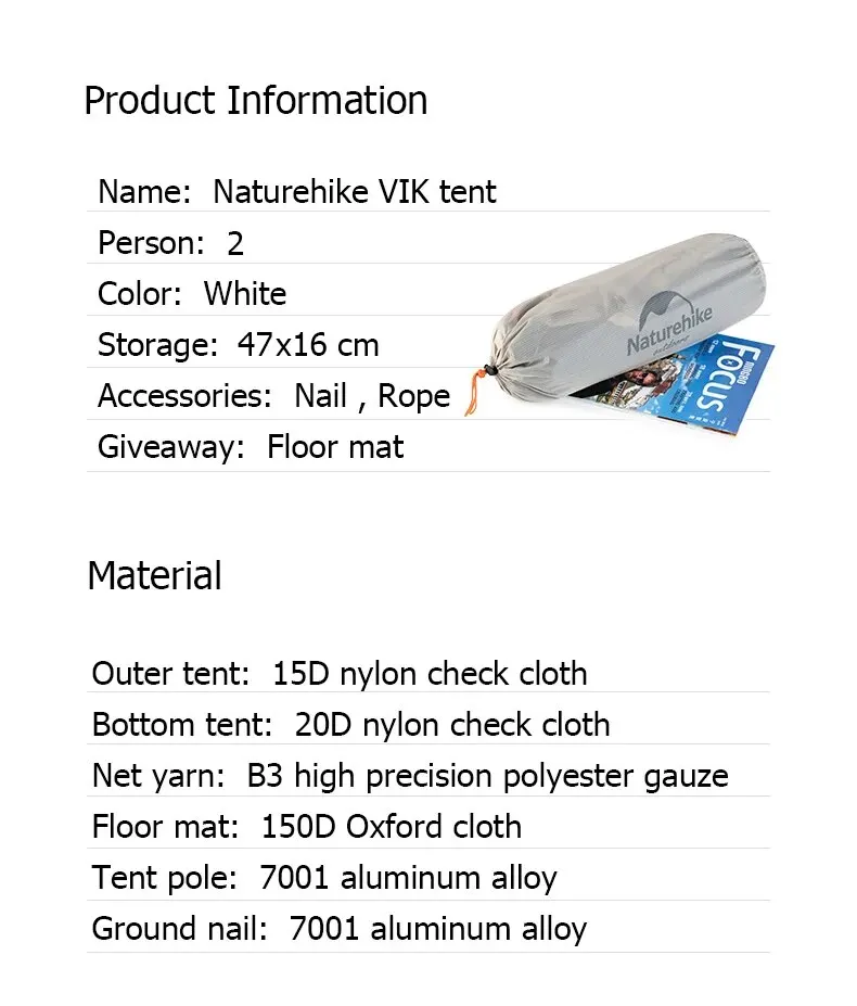 Descubra la combinación perfecta de portabilidad y durabilidad con la tienda de campaña Naturehike. Diseñada para los amantes de las actividades al aire libre, esta tienda ultraligera ofrece protección fiable contra las inclemencias del tiempo y garantiza su facilidad de uso durante viajes, senderismo y salidas a la playa. Con su construcción de tela de nailon y postes de aleación de aluminio, esta tienda es impermeable y resistente, ideal para acampar durante todo el año. Su amplia superficie de 113 x 90 x 210 cm (44,4 x 35,4 x 82,6 pulgadas) puede alojar cómodamente a una o dos personas, ofreciendo un acogedor refugio en la naturaleza.