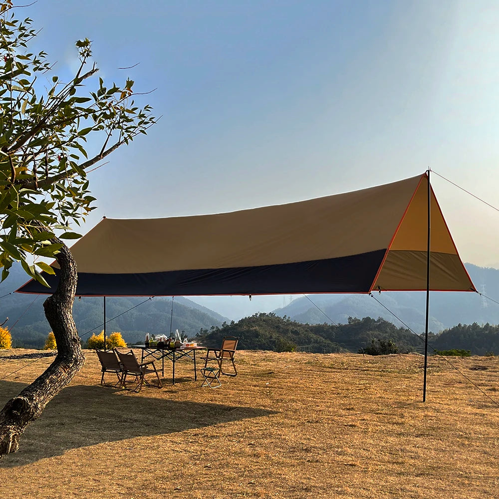Camping tarps are essential for creating flexible outdoor shelters that adapt to different weather conditions. This quadrangle sun shelter tarp includes multiple reinforced anchor points, allowing you to configure different shapes depending on your needs.