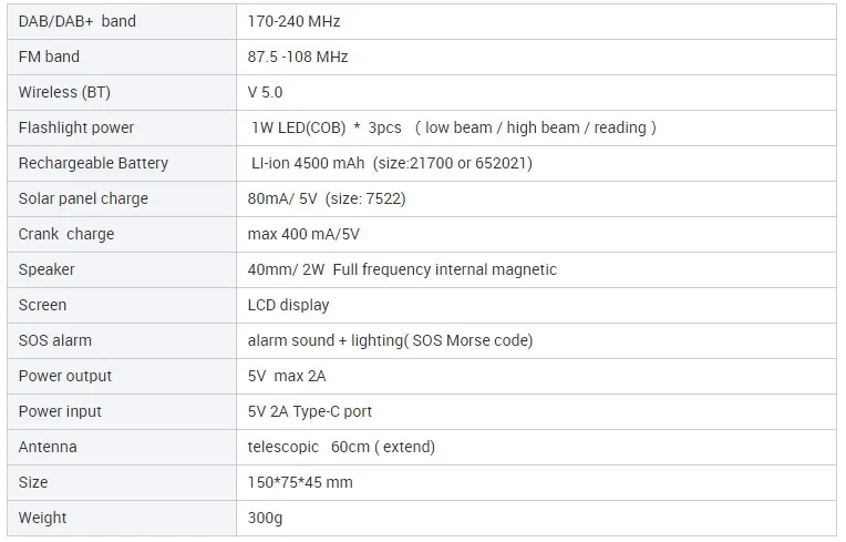Al elegir esta radio de emergencia multifuncional, se asegura de contar con una herramienta confiable para mantenerse conectado y con energía durante emergencias o actividades al aire libre. Sus completas funciones de radio, múltiples fuentes de alimentación y modernas funciones de conectividad la convierten en un complemento esencial para cualquier kit de emergencia o equipo para actividades al aire libre.