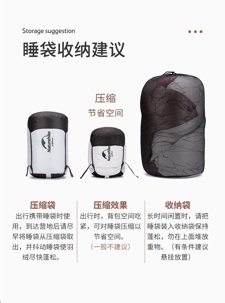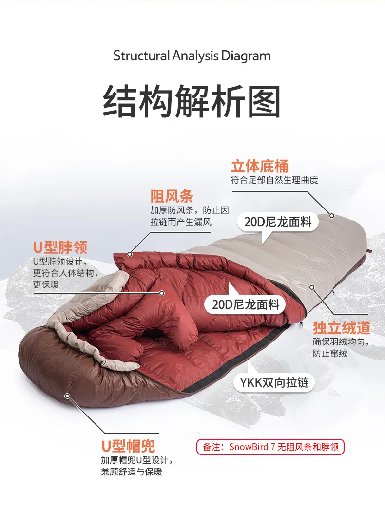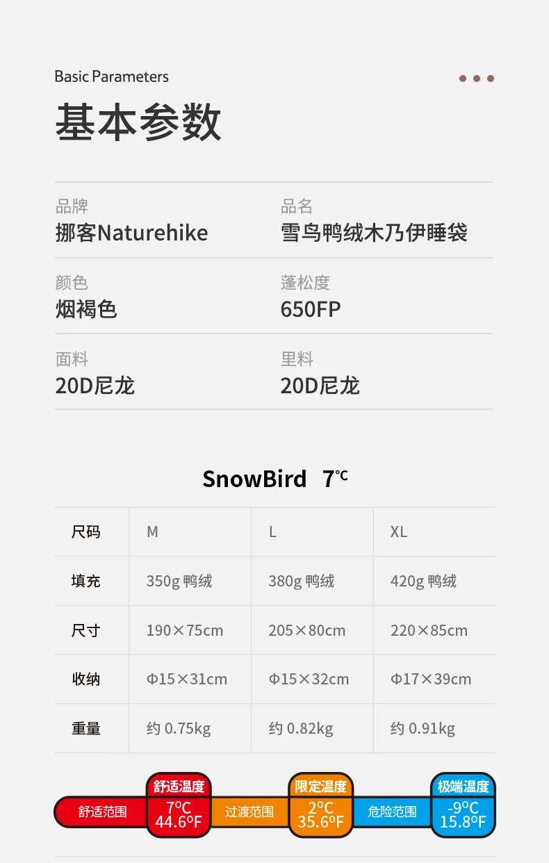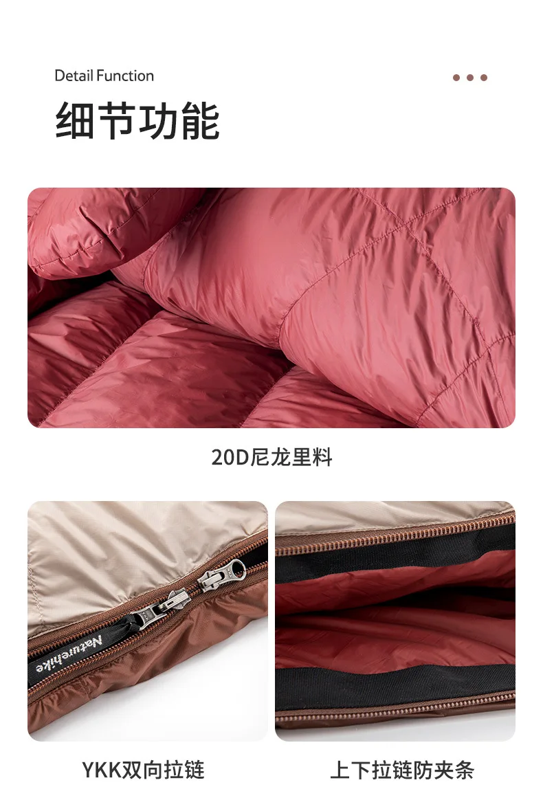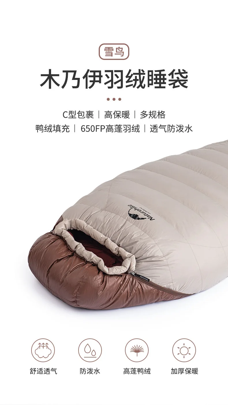 Presentamos el saco de dormir portátil Naturehike SnowBird 20D tipo momia para acampar al aire libre, el compañero perfecto para tus aventuras de senderismo invernal. Fabricado con materiales de primera calidad y un diseño innovador, este saco de dormir ofrece calidez y comodidad excepcionales en climas fríos. Relleno con 90 % de plumón de pato con un poder de relleno de 650 FP, proporciona un aislamiento superior a la vez que es ligero y portátil. Su diseño tipo momia garantiza la máxima retención de calor y un ajuste perfecto, manteniéndote abrigado durante toda la noche. Ya sea que acampes en la nieve o camines por paisajes helados, el saco de dormir SnowBird es tu equipo de confianza para explorar el invierno.