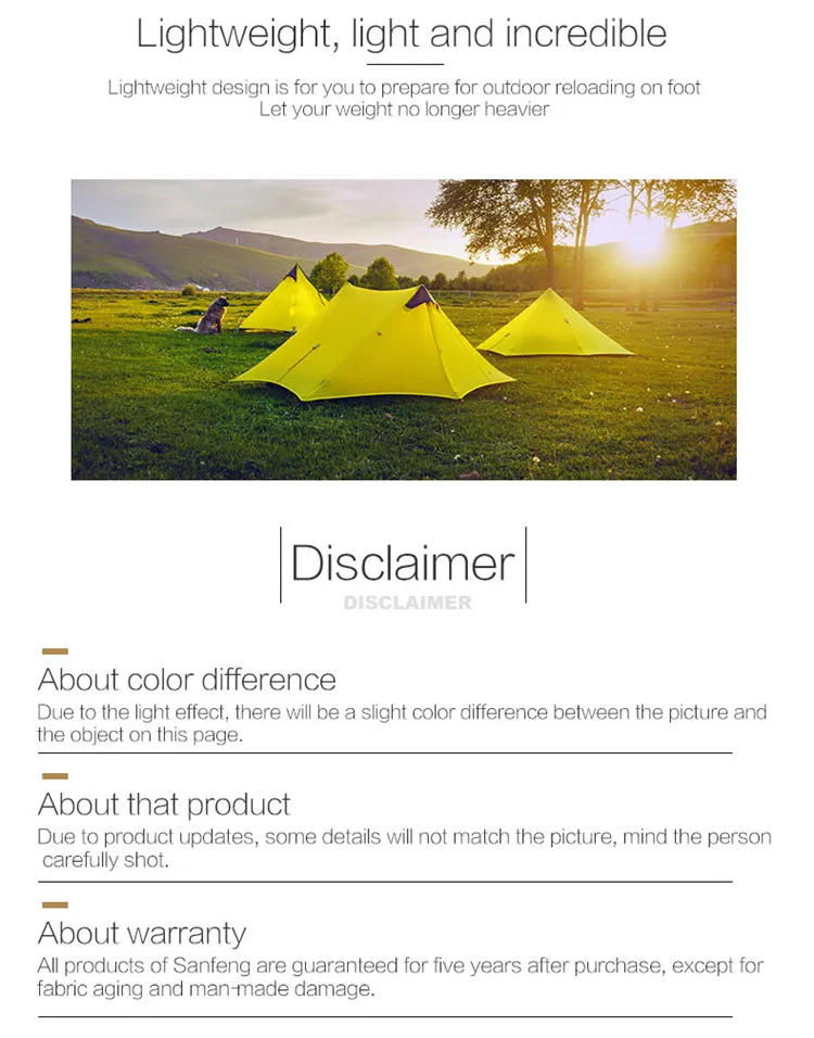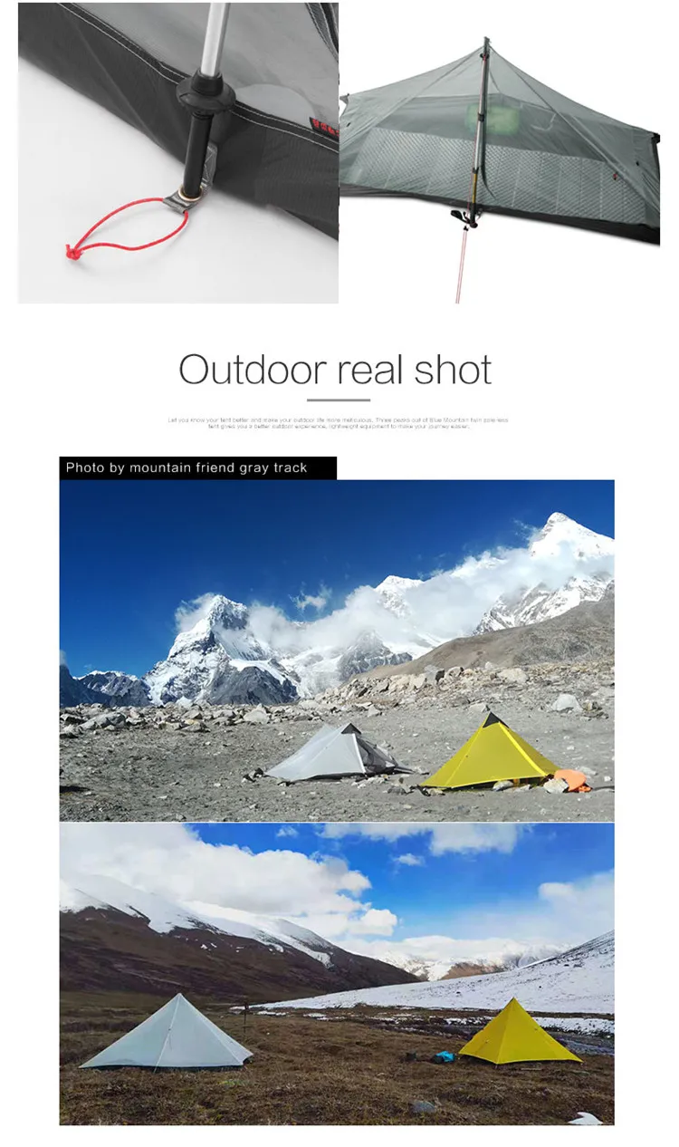 La 3F UL GEAR Lanshan 1 es una tienda de campaña ultraligera sin varillas de calidad profesional, diseñada para aventureros solitarios. Perfecta para senderismo, excursionismo y acampada, esta tienda está confeccionada con resistente tejido Silnylon 15D, que ofrece una resistencia e impermeabilidad excepcionales, manteniendo su ligereza. Diseñada para uso en tres estaciones, la Lanshan 1 garantiza comodidad y protección contra las inclemencias del tiempo sin sobrecargarte.