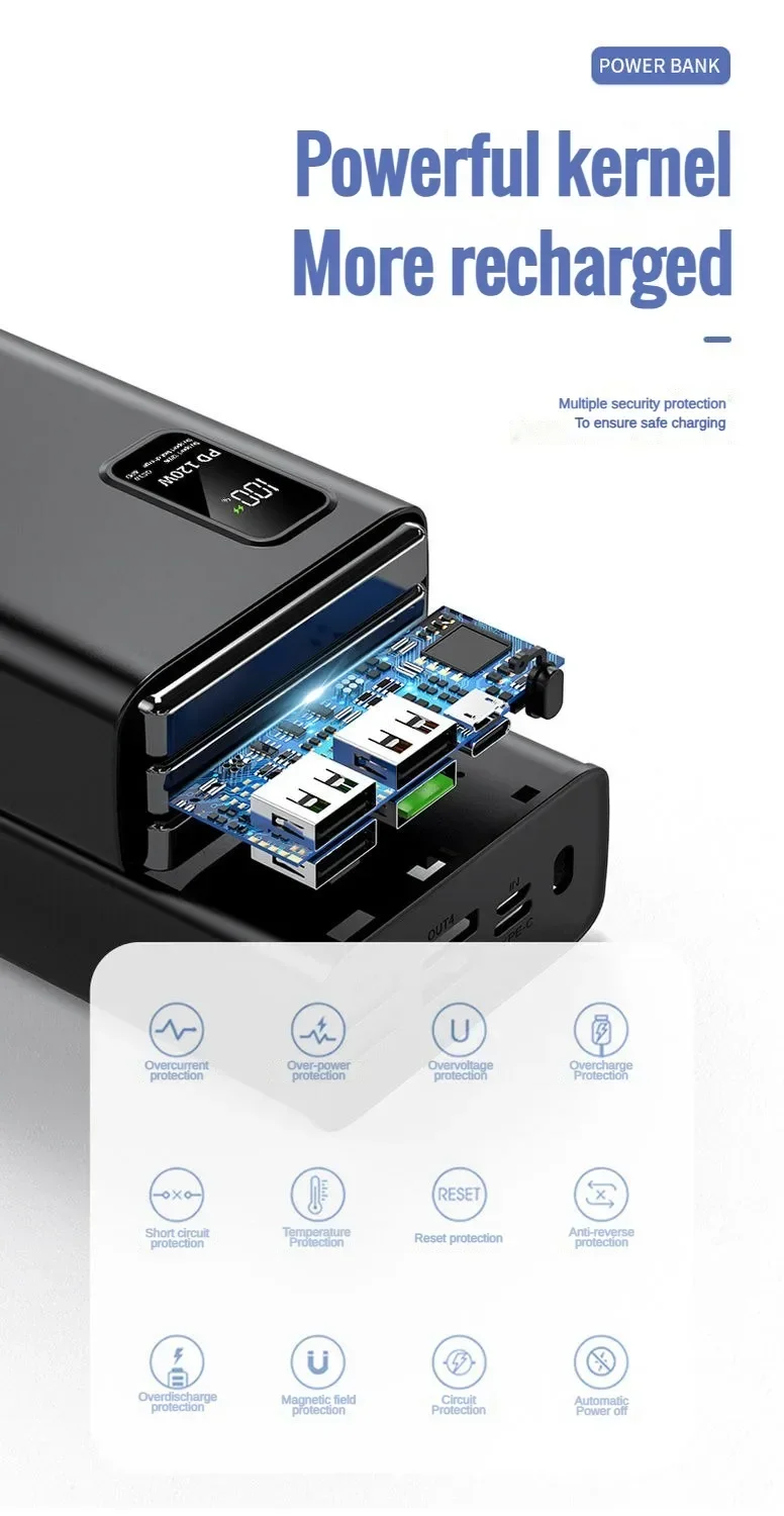 Mantén la energía dondequiera que estés con el Power Bank de 50000 mAh, un cargador portátil de alta capacidad diseñado para mantener tus dispositivos cargados en cualquier momento y lugar. Este versátil power bank cuenta con múltiples interfaces de salida, incluyendo USB-C, Lightning y carga inalámbrica, lo que lo hace compatible con una amplia gama de dispositivos como iPhone, Xiaomi, Huawei y Samsung. Con sus cables integrados, panel solar y pantalla digital, este power bank es perfecto para aventuras al aire libre, viajes y uso diario.