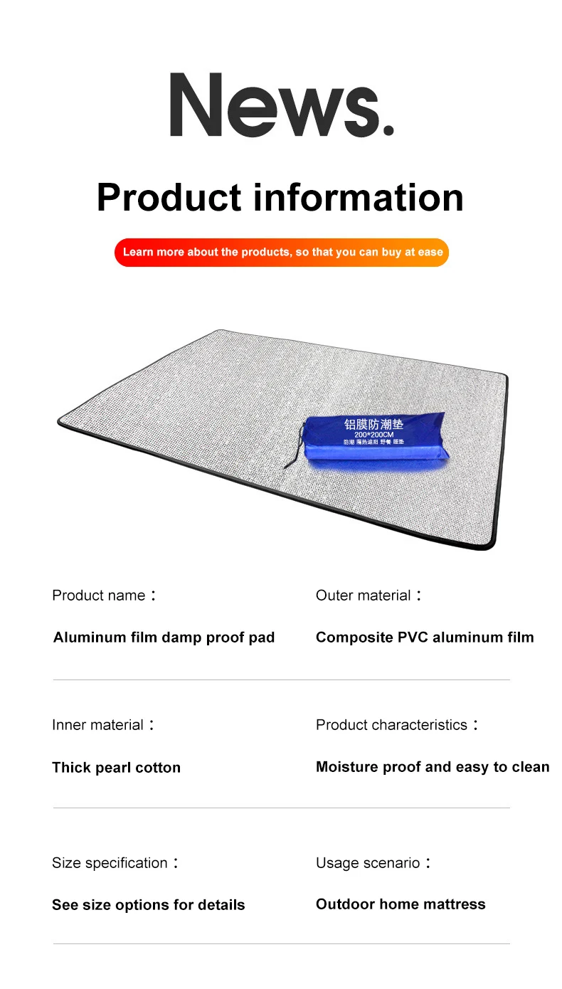 Nuestra colchoneta aislante plegable para exteriores destaca por su excelente aislamiento y resistencia a la humedad. Ya sea que acampe, haga un picnic o simplemente disfrute del aire libre, esta colchoneta le garantiza comodidad y sequedad. Su diseño ligero y plegable la hace muy portátil, y sus materiales duraderos garantizan un uso prolongado.