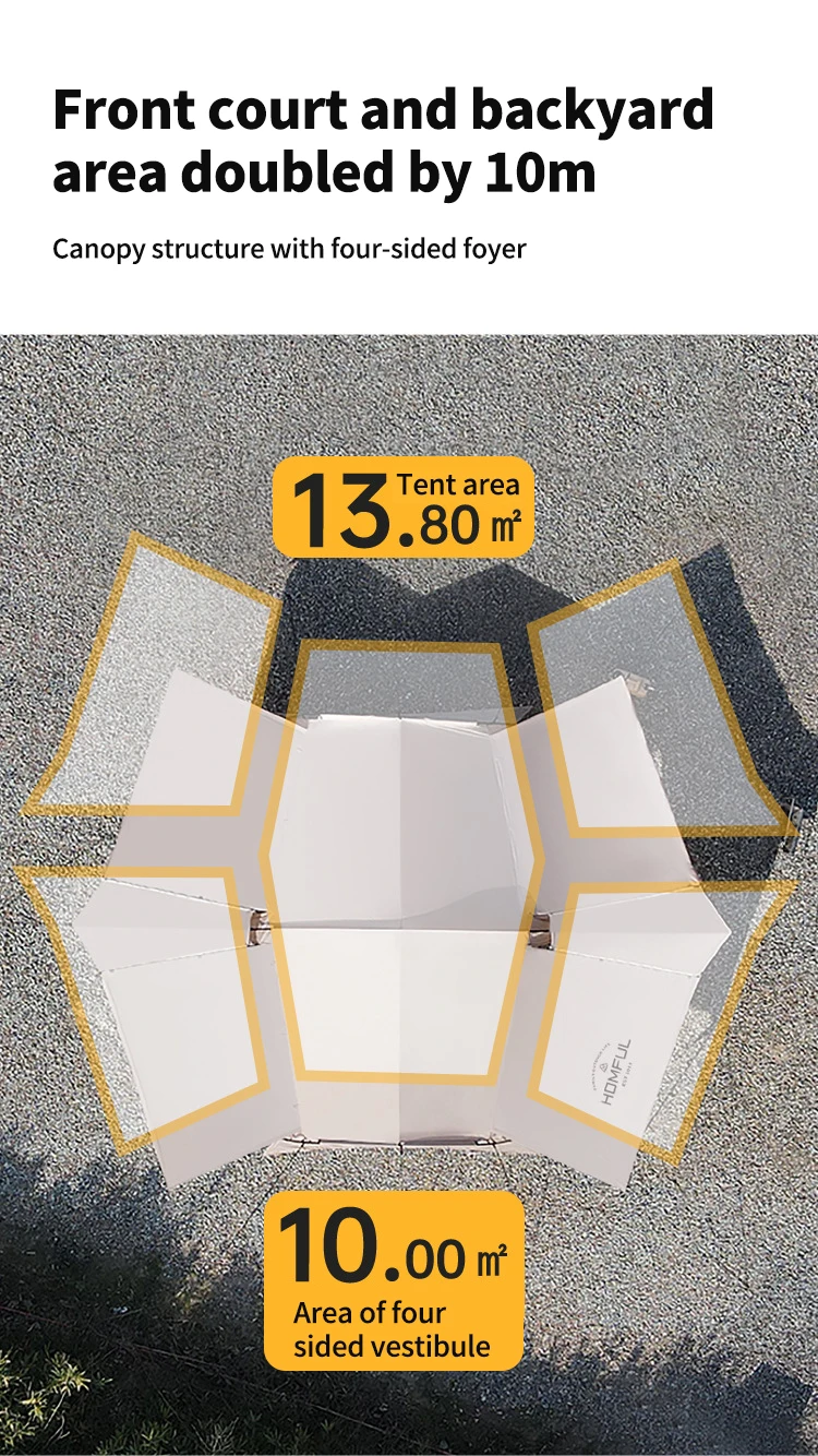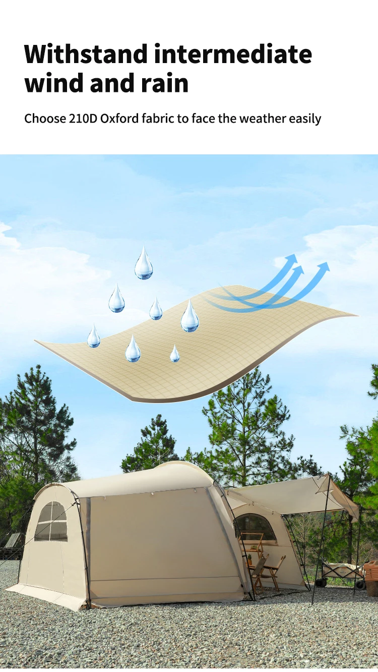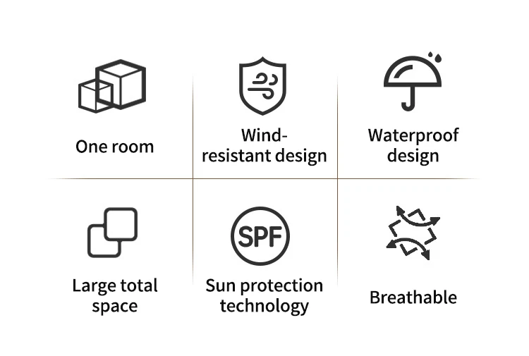 • Protección contra la intemperie: Resistente a la lluvia, al viento y al sol, con un índice de impermeabilidad de 2000-3000 mm tanto para la tienda como para la base.