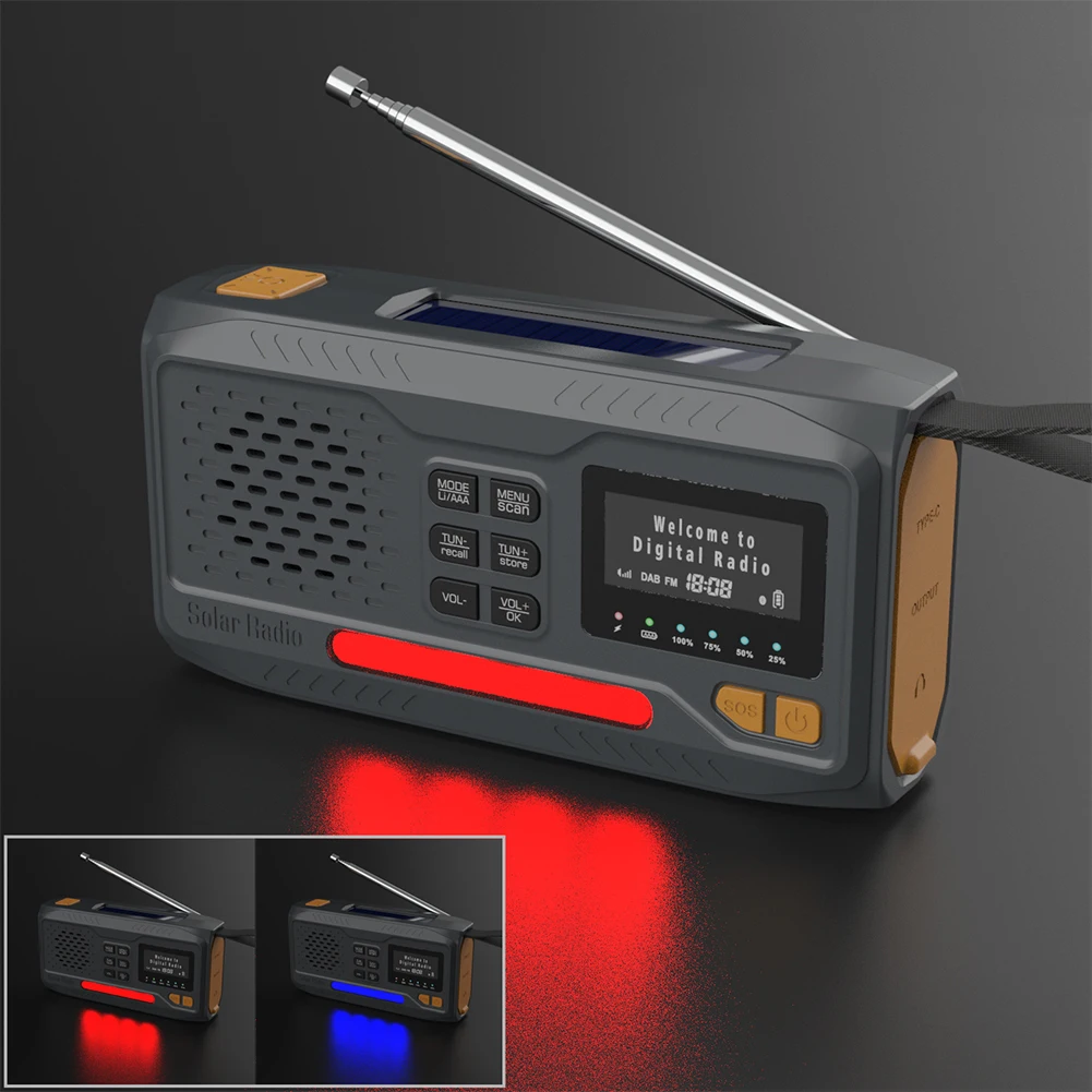 Radio de emergencia solar con manivela - 2000 mAh, recargable, compatible con DAB/FM/Bluetooth, con alimentación de 4 vías y lámpara de lectura para supervivencia cargando