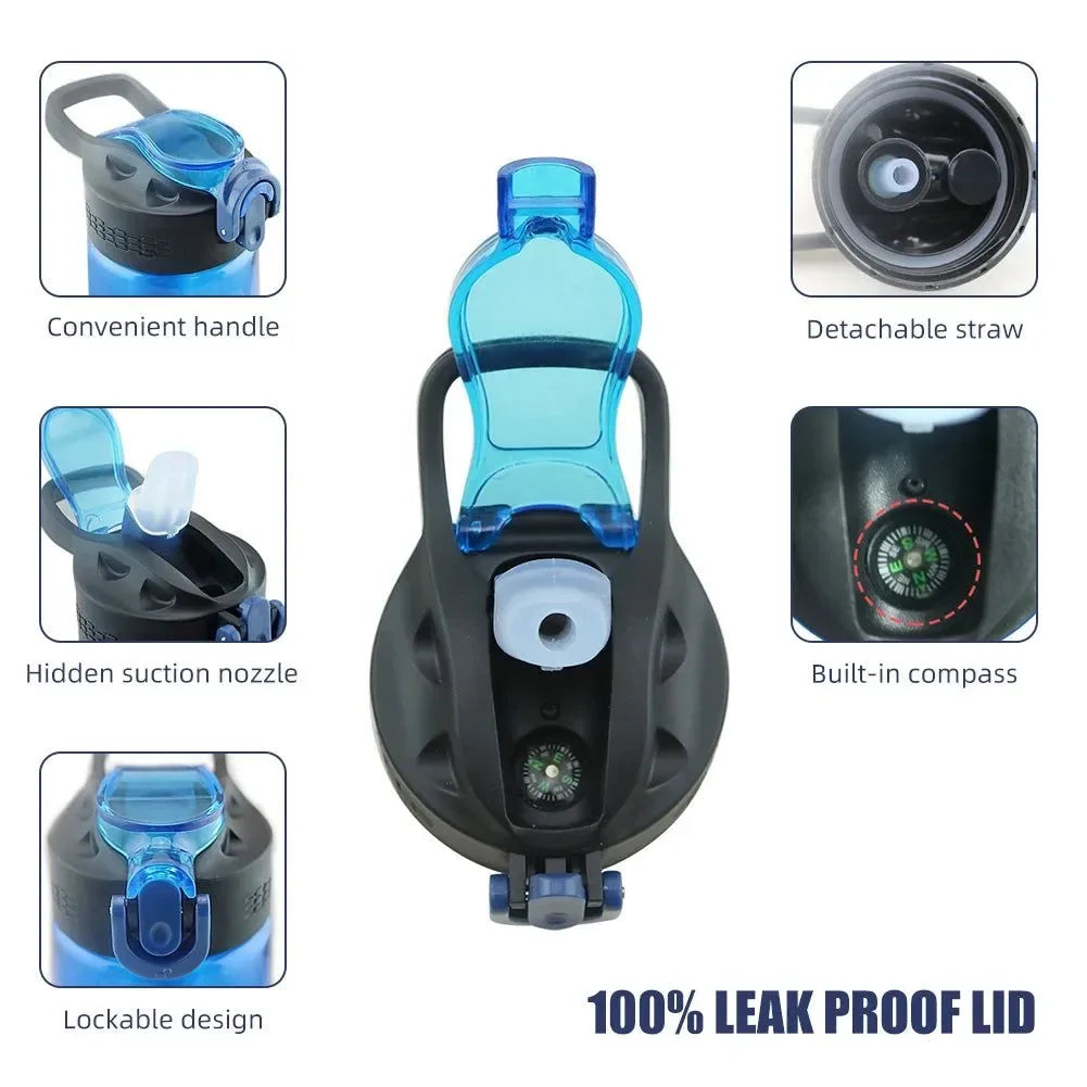 - [TAPA CON BLOQUEO Y BRÚJULA] La tapa con cierre y asa evita derrames de agua y facilita su transporte. La brújula integrada es una gran ayuda en caso de emergencia. También se puede colgar en la mochila gracias al mosquetón.