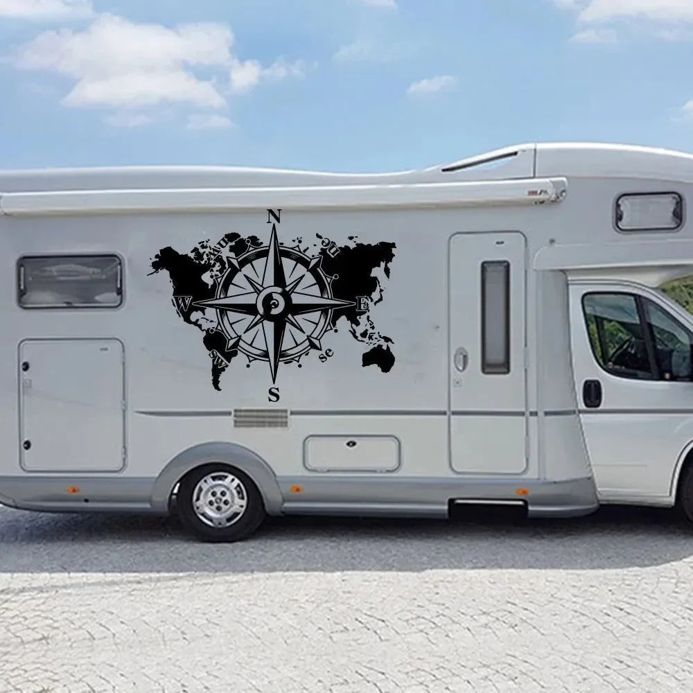 Compass World Map Caravan Car Sticker Decal - Vinyl Decor for Camper, RV, Motorhome, Off-Road Travel Adventure Truck - Trekker Essentials Compass World Map Caravan Car Sticker Decal - Vinyl Decor for Camper, RV, Motorhome, Off-Road Travel Adventure Truck - Trekker Essentials