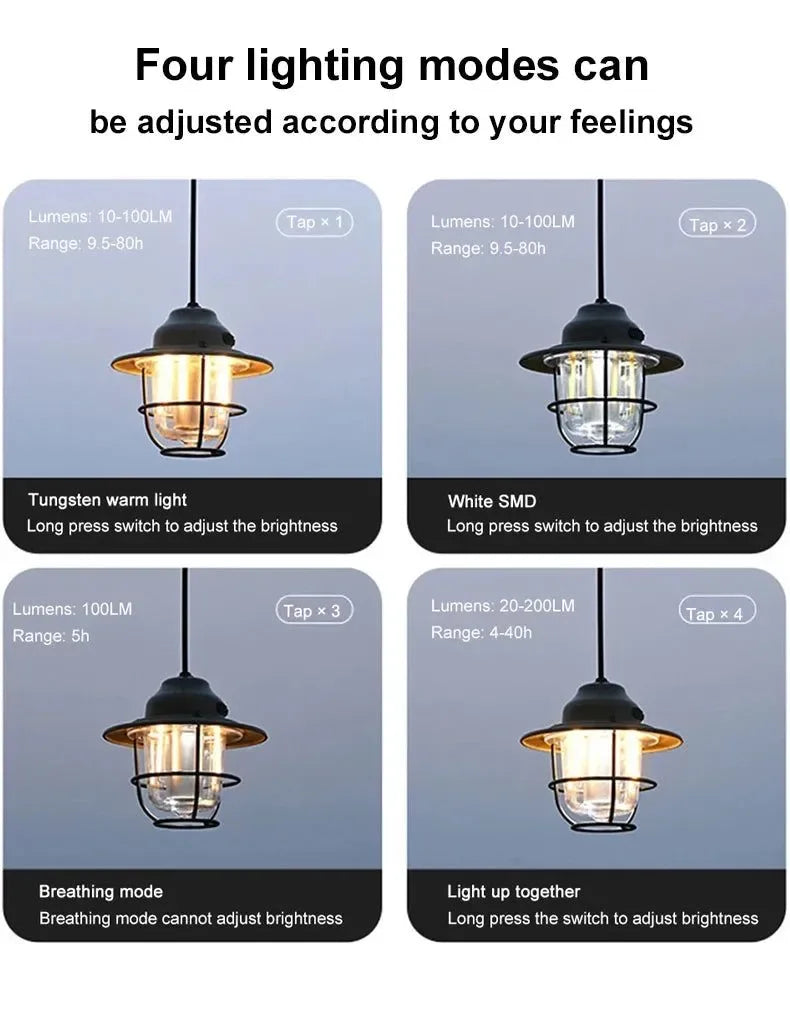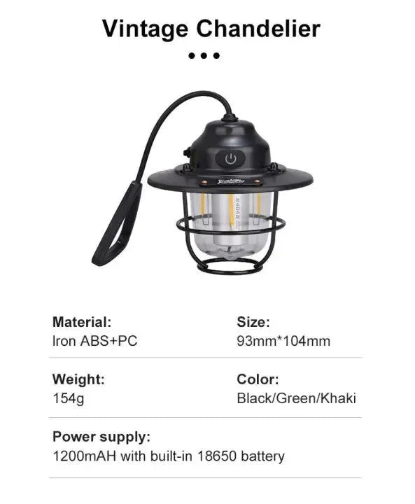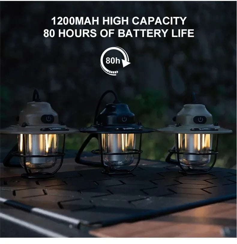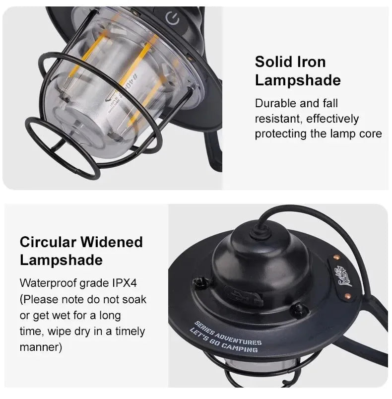 This vintage-style camping lantern combines 6 adjustable light modes (warm/cool white) with an 80-hour max runtime from its 1200mAh battery. Featuring IPX4 waterproofing, Type-C charging, and a durable iron-ABS construction, it's perfect for tents, emergencies, or outdoor adventures. The infinitely dimmable design offers both functional lighting and cozy ambiance. Includes quick-release buckle for easy hanging!