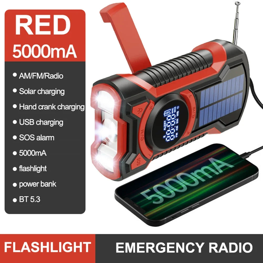 Solar Emergency Weather Radio Bluetooth-Compatible Hand Crank Phone Charger LED Flashlight SOS Alarm