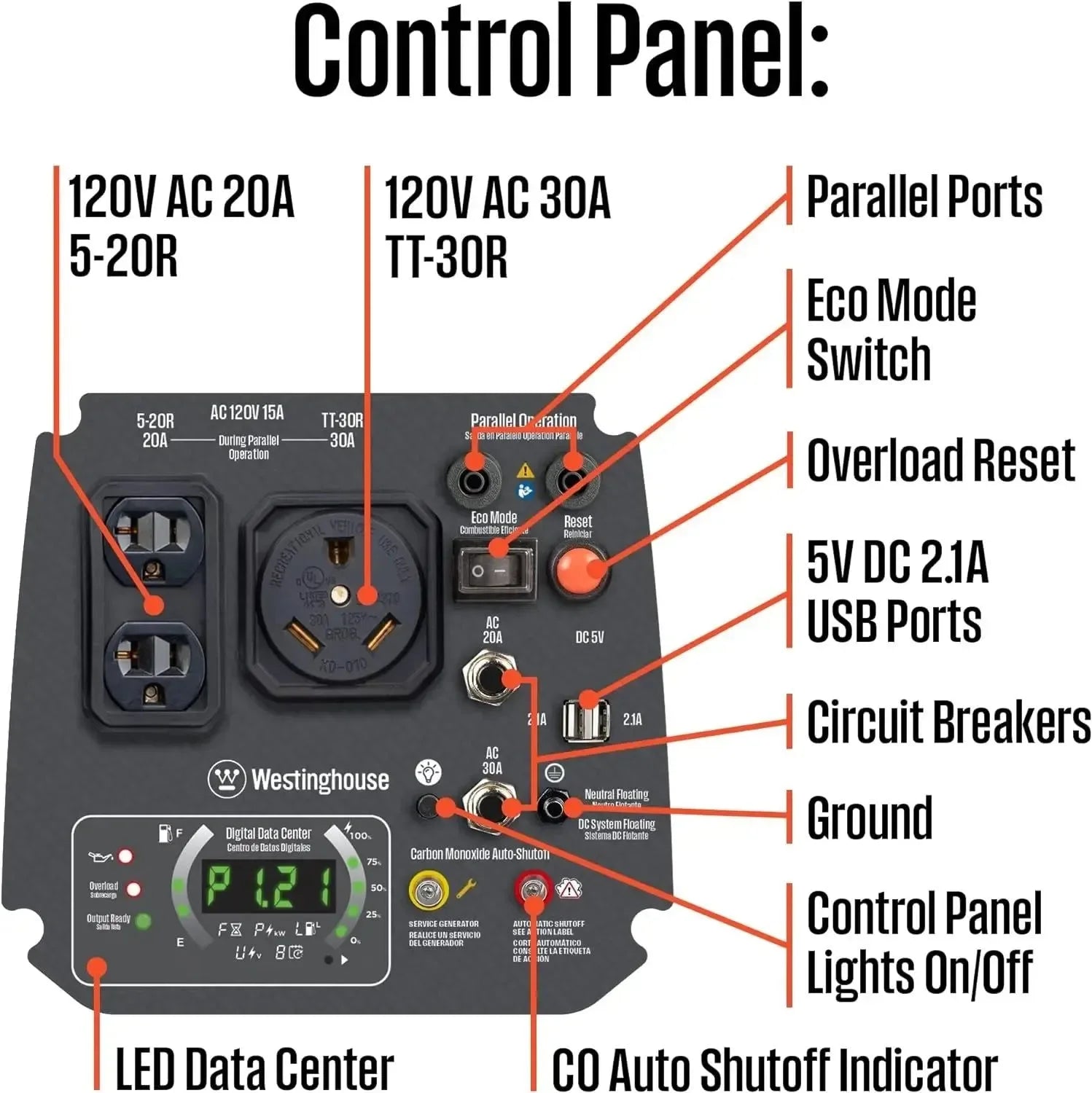 • 2550 Peak Watts and 1800 Rated Watts at Less Than 3% THD – Weighs Only 42.4 Lbs. – Gas Powered – One RV Ready TT-30R Outlet, Two 120V 20 Amp Outlets, and Two USB Outlets